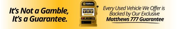 At Matthews our goal is to always provide you with the most upfront, no hassle OnePrice online 24/7 however, prices, mileage, and availability are subject to change and may not be reflected immediately on this website. For accurate up-to-date information, please call.  All advertised prices exclude government fees and taxes, including local and state taxes, finance charges, license and registration fees, and dealer document fees. Dealer makes no representations expressed or implied to any actual or prospective purchaser or owner of this vehicle as to the existence ownership accuracy description or condition of the listed vehicle's equipment accessories price specials or any warranties. Any and all differences must be addressed prior to the sale of this vehicle.